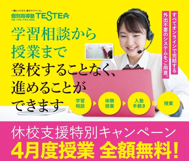 個別指導塾テスティー株式会社(本社:東京都杉並区、代表取締役:繁田和貴)は、新型コロナウイルス感染症の影響拡大による休校で在宅学習を続ける全国の小学生・中学生・高校生に向けて、Zoomを活用した1対1のオンライン授業WEB個(ウェブコ)の体制を強化し、休校支援プログラムとして4月度授業を無料提供します。