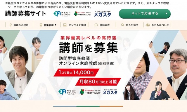 株式会社バンザン(本社:東京都新宿区、 代表取締役社長:山田博史)が運営する「大学受験専門・家庭教師メガスタディオンライン」「全国私立校定期テスト対策 ・家庭教師メガスタ」は、オンラインで学習指導が可能な「オンライン家庭教師」を全国から募集する為、講師募集サイトをリニューアルいたしました。