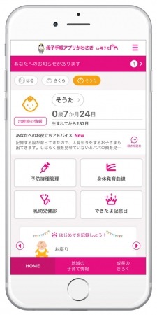 川崎町に採用された『母子手帳アプリかわさき』は、スマートフォン・タブレット端末・PCに対応したサービスで、妊産婦と子どもの健康データの記録・管理や予防接種のスケジュール管理、出産・育児に関するアドバイスの提供など、育児や仕事に忙しい母親や父親を助けてくれる便利な機能が充実しています。