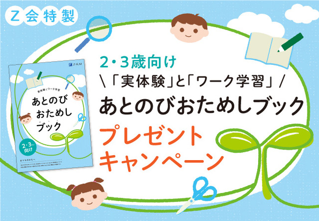 株式会社増進会ホールディングス(Z会グループ)のグループ会社である株式会社Z会は、「Z会の通信教育」幼児コースにおいて、2・3歳児向けの期間限定教材『あとのびおためしブック』が無料でもらえるキャンペーンを2020年11月16日(月)まで実施します。ぜひこの機会にお申し込みください。