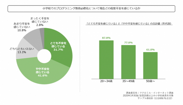 ・プログラミング教育必須化に対して不安を感じている教員は全体で7割以上、20-34歳では約9割
