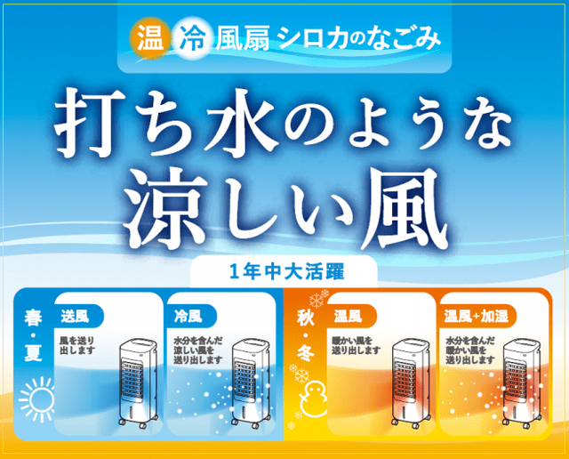 夏は水を含んだ冷たい風でひんやり涼しく、冬は暖めながらぽかぽか加湿してくれる、1年中使える温冷風扇です。