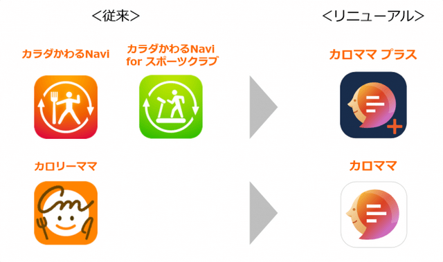 「カロリーママ」「カラダかわるNavi」「カラダかわるNavi for スポーツクラブ」、3つのアプリのアプリ名・アイコンデザインを変更します。
