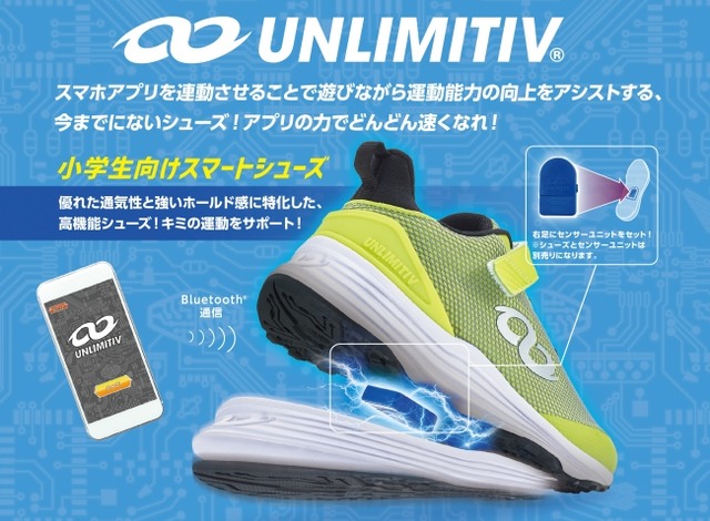 専用のセンサーユニット(別売り)をシューズにセットし、スマートフォンアプリと連動させてトレーニング結果をデータ化、ためたポイントをアプリ内のゲームに使って楽しめる小学生向けスマートシューズです。ブランド名である『UNLIMITIV』は、「Unlimited(無限の)+Active(活動的な)」の造語で、遊びながらユーザーの無限の能力を引き出す存在になりたいという思いを込めています。またロゴの「∞」マークは無限大の記号をモチーフにしています。より多くの子どもたちに楽しみながらスポーツを継続してもらうために、さらに進化した『UNLIMITIV』を発売します。