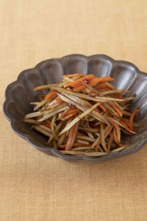 塩分1.2%、糖分4%。ごぼうとにんじんが150g。調味パーセントは、重さに対しての割合を考えます。ごぼうとにんじんの重さが150gで、塩分1.2%ということは、1.8gの塩が必要ということ。次に、塩の分量を、しょうゆに換算します。しょうゆ小さじ1は塩分0.9g。だから、必要なしょうゆの分量は、小さじ2。同じように考えて、糖分4%ということは、6gの砂糖が必要。砂糖小さじ1は糖分3g。だから、砂糖の分量は、小さじ2。