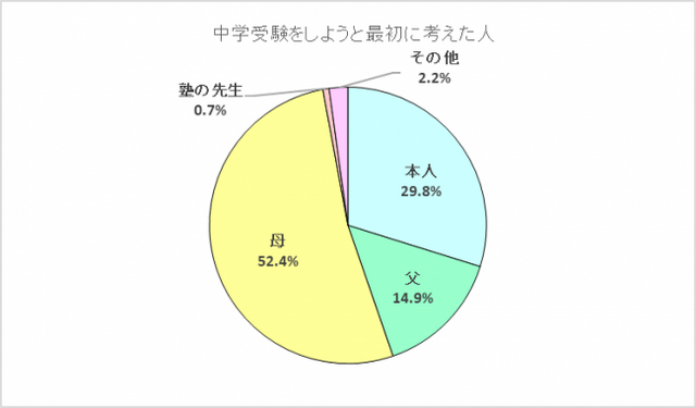 私立・国立中学を受験した家庭の半数以上が「母」が受験のきっかけとなっている一方、公立中高一貫校受検では「本人」や「父」の割合も高く、きっかけにも違いがあることが明らかとなった。