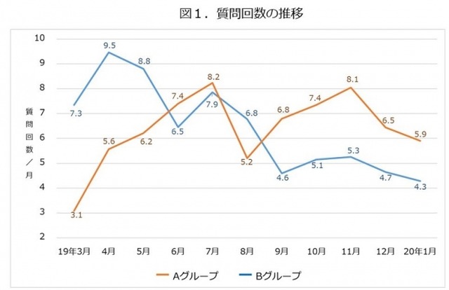また、時系列でみると、Bグループの質問回数は減少傾向にあるのに対し、Aグループの質問回数は、8月に一度落ち込んではいるものの、全体として高い水準で推移しています。