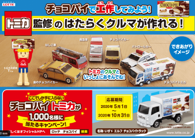 株式会社ロッテは、チョコパイ×トミカ50周年記念キャンペーンを企画し、キャンペーンでしか手に入らないトミカ50周年記念ビジュアルがデザインされたチョコパイトミカを誕生させました。2020年5月1日(金)00:00よりスタートします。また、同時期にチョコパイの箱では工作企画としてトミカ監修のはたらくクルマがパッケージ裏面で作れる企画もスタートします。是非親子でチョコパイパッケージを使って金のチョコパイカーやチョコパイトミカなど、ここだけの工作トミカをお楽しみ下さい。