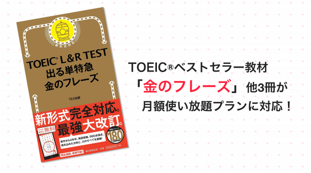 そこでこの度、人気TOEIC教材の著者であるTEX加藤氏と朝日新聞出版の協力のもと、株式会社Globeeが運営するabceedの定額課金プランであるUnlimitedプランおよびUnlimited PlusプランにてTEX加藤氏の人気4書籍「TOEIC(R) L&R TEST 出る単特急 金のフレーズ」・「TOEIC(R) L&R TEST 出る単特急 銀のフレーズ」・「TOEIC(R) L&R TEST 出る単特急 金のセンテンス」・「TOEIC(R) L&R TEST 出る単特急 金の熟語」(朝日新聞出版)の掲載を開始いたします。従来、これらの書籍を使用するためにはアプリ内で追加購入が必要でしたが、UnlimitedプランおよびUnlimited Plusプランの会員は追加課金なくご利用いただくことが可能となります。