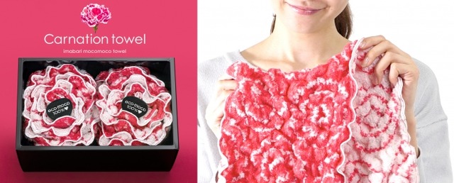 「カーネーションタオル」は、2008年にグッドデザイン賞を受賞した“モコモコタオル”をベースに母の日に贈る花・カーネーションをモチーフに作られたオリジナルタオルです。カーネーションのフリルのような可愛らしい花びらを当社独自のモコモコ加工で表現。専用のギフトボックスにセットしてまるでフラワーボックスのような華やかなタオルギフトに仕上げました。