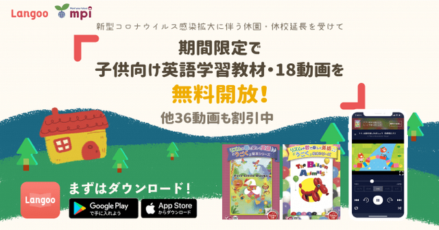 今回の新型コロナウイルスの感染拡大に伴う休校・休園延長を受け、子ども向け英語教材/Ed-techとそれぞれ英語学習を推進するmpi松香フォニックス社/Langoo社として貢献できることを両社で協議した結果、細やかではございますが、このような決定をいたしました。