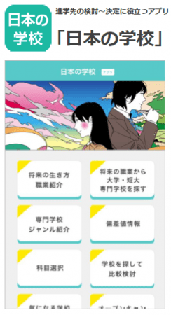 大学進路希望者には、国公立大学の偏差値情報一覧や科目選択情報、専門学校希望者には、512職業の職業紹介や22種類のジャンル紹介を行い、大学・短期大学や専門学校の進学先の検討~決定に役立つ、無料でご活用いただけるアプリです。