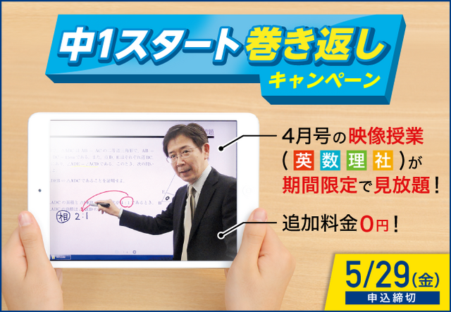そこでZ会では、ご入会して頂いた方に向けて、4月号のiPadスタイルの「映像授業」を特別公開し、中1最初の単元から基礎を徹底理解していただける「中1スタート巻き返しキャンペーン」を実施しております。