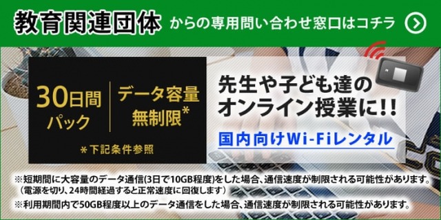 「イモトのWiFi」は、家庭にインターネット環境がない子ども達がオンライン授業を平等に受けられるよう、30日パックのデータ容量無制限*(4G/LTE)にて、価格をできる限り抑えた形で、いただいたお問合せに対して期待にお応えできるよう、尽力してまいります。