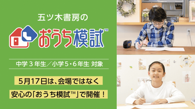 近畿圏で中学、高校受験の公開模擬テストの企画開発、運営を行う株式会社五ツ木書房(本社:大阪市、代表取締役社長:池上佳嗣、以下:五ツ木書房)は、新型コロナウィルスの影響により自宅学習を行う中学3年生、小学5,6年生を対象に、自宅で受けられる「おうち模試TM」を実施します。長年にわたり、受験生・保護者・塾・中学校・高校から信頼をお寄せいただいている五ツ木模試、五ツ木・駸々堂模試の新作問題にチャレンジ、その成績から暫定偏差値を算出し、五ツ木独自の志望校判定を行います。現在の学力と弱点を把握し、志望校との距離を計ることは、受験に向かう意欲を育みます。申し込みは5月7日(木)から5月12日(火)まで、公式Webサイトなどで受け付けています。