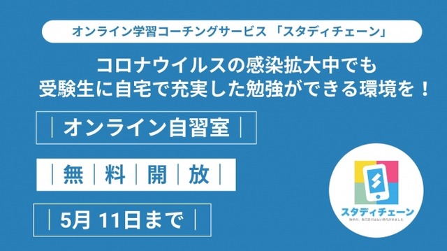 オンライン学習コーチングサービス「スタディチェーン」はコロナウイルス感染拡大防止に伴う全国臨時休校の状況を鑑み、4月12日から5月12日まで1ヶ月間無料でオンライン自習室を提供します。