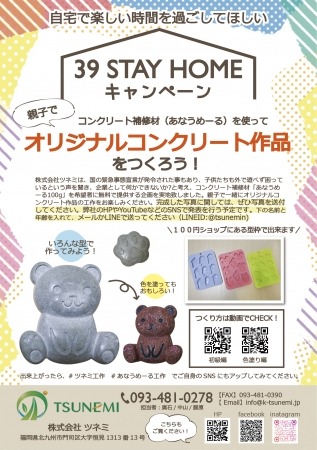 株式会社ツネミ(本社:北九州市門司区、代表取締役:廣石武彦、以下「当社」)は、2020年5月14日(木)9時から“39(ありがとう) STAY HOME キャンペーン”として、限定390人に対して、自社ECサイトを通じてコンクリート補修材「あなうめーる100g」を希望者に無料で提供します。