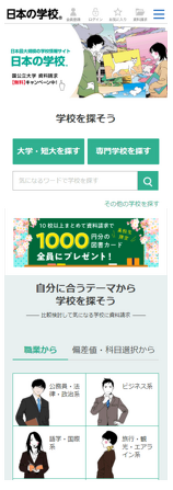 トップページは、シンプルですっきりとしたデザインにし、自分に合うテーマから学校を探せます。大学進路希望者には、偏差値情報や科目選択から学校を探す、専門学校希望者には、512職業の職業紹介を行い、よりスムーズに検索、情報収集していただけるようになりました。