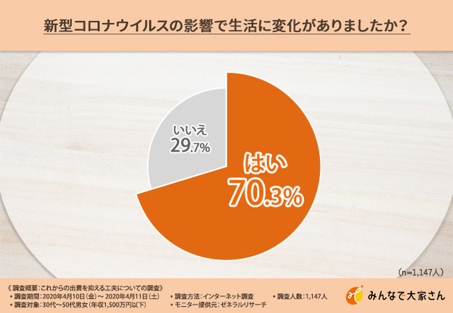 「新型コロナウイルスの影響で生活に変化がありましたか?」と質問したところ、実に7割以上の方が『はい(70.3%)』と回答しました。