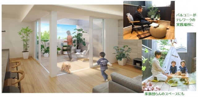 この数年、都市部を中心に狭小な立地の住宅でリビングを2階に配置する事例も増えています。そこで家族と近くにいながらも、テレワーク・リモートミーティングが実践できる場、気分転換を行える場として、「2階バルコニーの存在」に着目、青空オフィス利用や縁側使い、アウトドアリビングなど 3種類のプランによる木造住宅用の新パッケージ『プラスワンリビングバルコニー』を新たに開発、北海道・東北地区を除く関東以西を対象に2020年6月1日(月)より発売を開始します。