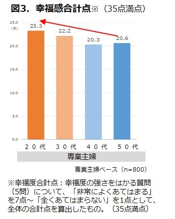 20代から50代の専業主婦の幸福感を調べたところ、若年ほど幸福感の点数が高いことが分かりました(図3)。