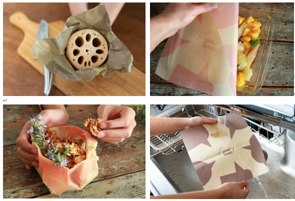 1枚で3役(保存・持ち運び・サーブ)を兼ね、カタチを変えて多様な使い方ができ、さらに洗って繰り返し使えます。身近なプラスチック製品である「ラップ」の代わりとして、食材をくるんだり、一時的なフタになったりします。また、商品購入時についてくるビニールの袋の代わりにもなります。