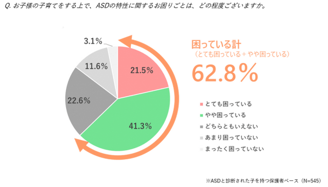 ■「ASDと診断された子」の保護者の6割以上が、「子育てをする上で困っていることがある」と回答。