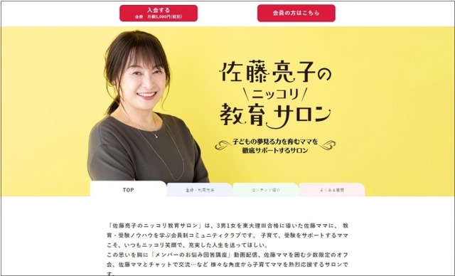 「佐藤亮子のニッコリ教育サロン」は三男一女を東大理III合格に導いた佐藤ママに、教育・受験ノウハウを学ぶ会員制コミュニティクラブです。子育て、受験をサポートするママこそ、いつもニッコリ笑顔で、充実した人生を送ってほしい。この思いを胸に「メンバーのお悩み回答講座」動画配信、佐藤ママを囲む少数限定のオフ会、佐藤ママとチャットで交流…などさまざまな角度から子育てママを熱烈応援するサロンです。