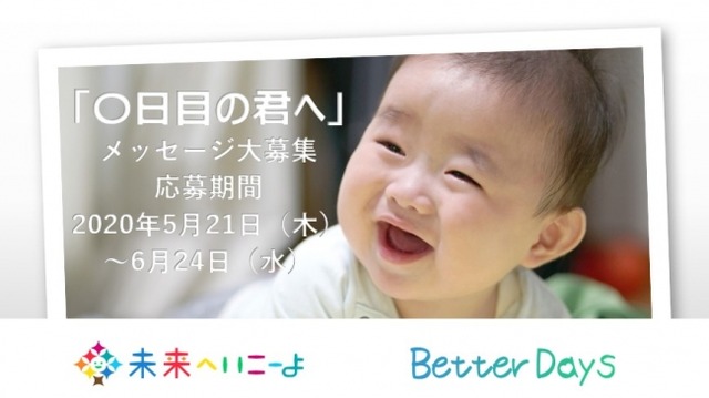 新型コロナの影響で休校やリモート勤務などが増え、子どもと一緒に過ごす時間が増えているという家庭が多くあります。一緒に過ごせる時間が増えることは幸せなことであるものの、逆にストレスを抱えて子どもを叱ることが増えてしまい、親も子も疲弊してしまうという声も聞こえてきます。そこで、アクトインディは親子の絆を再確認できる企画としてわが子へのメッセージ「〇日目の君へ」を募集いたします。いただいたメッセージの一部は子育て情報サイト「未来へいこーよ」でご紹介させていただきます。