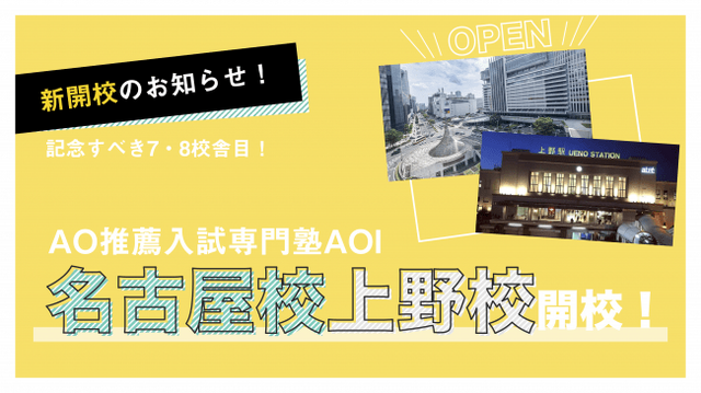 株式会社花形が運営するAO推薦入試専門塾AOIは6月1日(月)に、7校目となる上野校、8校目となる名古屋校が開校いたします。圧倒的な合格率の高さを誇るAOIが、これまでよりももっと通いやすくなります。