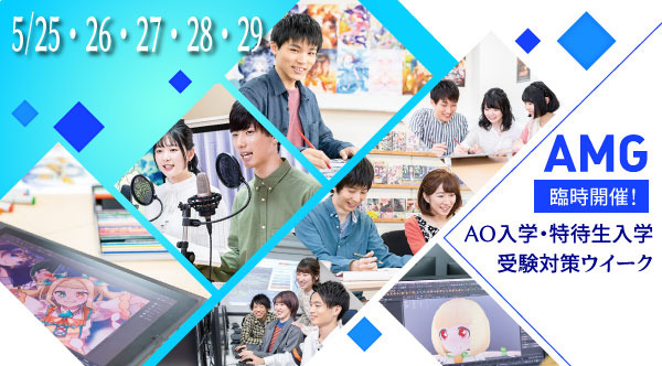 エンタメ業界の即戦力を育成する大阪アミューズメントメディア専門学校(大阪市淀川区、理事長:吉田 尚剛、以下 大阪AMG)は、6月1日(月)からスタートするAO入学・特待生入学に向けての申込に先駆け、『受験対策ウィーク』と題したイベントの開催を決定しました。期間は、5月25日(月)~5月29日(金)の1週間。YouTubeを使った「オンライン講座」と、来校しての「個別進学相談会」を毎日開催します。