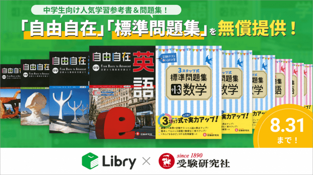 このたび、株式会社Libryと株式会社増進堂・受験研究社は、休校等によって家庭学習に取り組む中学生を支援するために、オンライン授業の補助や自習に最適な参考書「自由自在」(英語・数学・理科・社会)と「標準問題集」(英語・数学)をデジタル化し、「リブリー」にて無償で提供します。これまでも、個社でコンテンツの無償提供など休校期間の学習支援を行ってまいりましたが、休校期間の長期化で学習格差が拡大していることを受けて、より多くの子供たちの学習を支援できるよう協働してまいります。