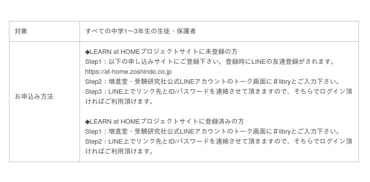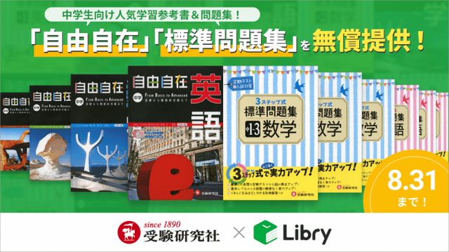 このたび、株式会社増進堂・受験研究社と株式会社Libryは、休校等によって家庭学習に取り組む中学生を支援するために、オンライン授業の補助や自習に最適な参考書「自由自在」(英語・数学・理科・社会)と「標準問題集」(英語・数学)をデジタル化し、「リブリー」にて無償で提供します。これまでも、個社でコンテンツの無償提供など休校期間の学習支援を行ってまいりましたが、休校期間の長期化で学習格差が拡大していることを受けて、より多くの子供たちの学習を支援できるよう協働してまいります。
