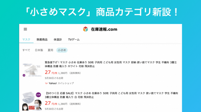 在庫速報.comでは5月21日に「夏用マスク」を追加しましたが、今回さらに子供・女性用として需要の高い「小さめマスク」カテゴリーを追加しました。一般的に「ふつう」サイズとして販売されているマスクは子供や女性の顔には大きく、フィットしない場合があります。今回新設した「小さめマスク」カテゴリーでは、子供や女性向けに小さめに作られたマスクを簡単に探せるようにしました。