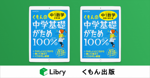 このたび、株式会社Libryと株式会社くもん出版は、『くもんの中学基礎がため100% 中1数学 計算編』と『くもんの中学基礎がため100% 中1数学 関数・図形編』を「リブリー」でご利用いただけるようデジタル化し、発売することとなりました。毎日の予習・復習、定期テスト対策に最適な問題集を、PC・タブレット・スマホで、スマートに学習していただけます。