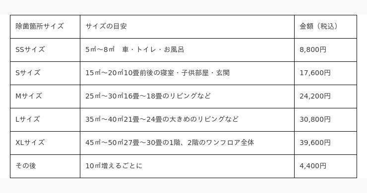 除菌サービスは、店舗や自宅の広さにより料金が変わります。