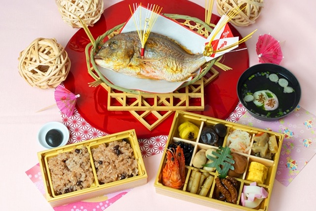 15品(祝い鯛・寿栗・黒豆・椎茸旨煮・里芋煮・卵焼き・蒲鉾・海老塩焼き・筑前煮・紅白なます・梅干し・牛蒡・蛸・赤飯・蛤汁)
