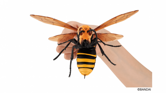 本商品は「すずめばち」を生物学的に研究し、全長約150mm、全幅約200mmと驚異の大きさとリアルな造形で再現したカプセル自販機専用商品です。実際の蜂と同様に針の出てくる仕組みを再現したり、顎の開閉や触覚の角度調整など全身18箇所が可動します。また、普段見ることの難しい舌や翅脈(しみゃく)も忠実に再現しており、「だんごむし」「かめ」等の「いきものシリーズ」で培った技術を集約した「神秘的な昆虫の生態」を感じることができるリアル可動フィギュアとなっています。