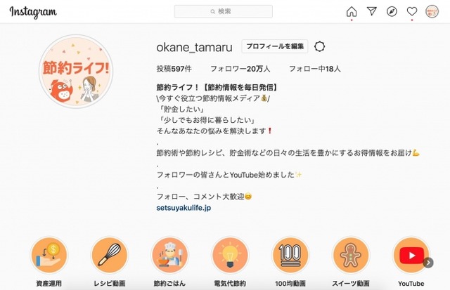「節約ライフ!」は、今日からできる節約術や収入UP術を日本一わかりやすく解説しているメディアです。2019年11月から運用を開始したInstagramアカウントでは、20代後半~40代前半の主婦にターゲットを絞り、ライフハック術や節約レシピなどの節約情報を毎日発信しています。