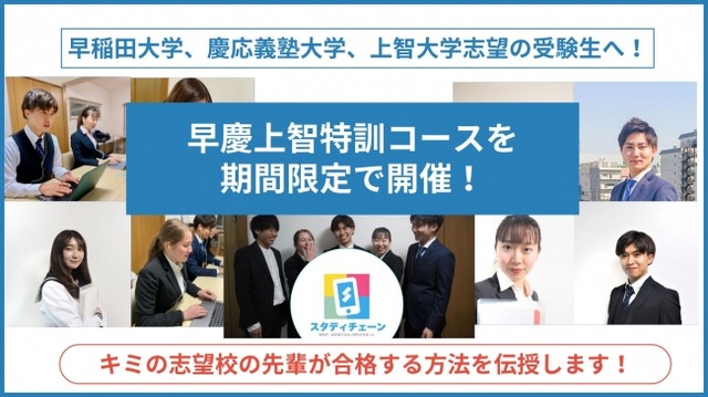 受験勉強に悩みを抱えている方へ!私たち、早稲田大学、慶応義塾大学、上智大学のみが講師として活躍するオンライン受験コーチングサービス「スタディチェーン」の「早慶上智特訓コース」が悩みを全て解決します!
