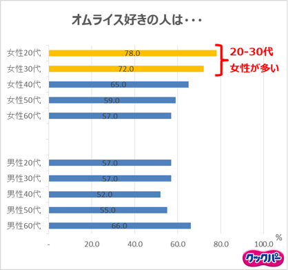 オムライス好きは20代女性(78.0%)・30代女性(72.0%)と高く、目玉焼き好きは男女とも60代で8割近い数値となっている。