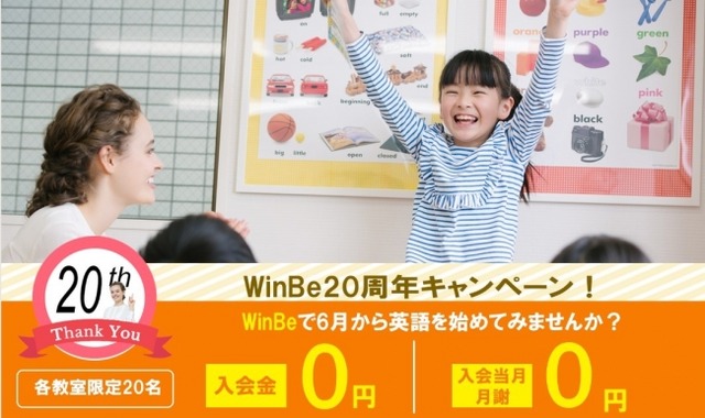 株式会社やる気スイッチグループ(東京・中央区、代表取締役社長:高橋 直司)が展開する子ども向け英語・英会話スクールのWinBe(ウィンビー)は、2000年6月の設立から20周年を迎えたことを記念して、新規入会生を対象に、入会金および当月授業料を無料にする『WinBe 20周年キャンペーン』を6月末まで期間限定で実施します。(各教室20名まで)