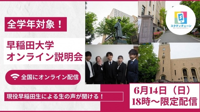 オンライン学習コーチングサービス「スタディチェーン」では、新型コロナによる春の説明会中止の影響を低減し、首都圏以外の受験生の情報格差を解消するために「早稲田大学オンライン説明会」を2020年6月14日(日)20時より配信します。