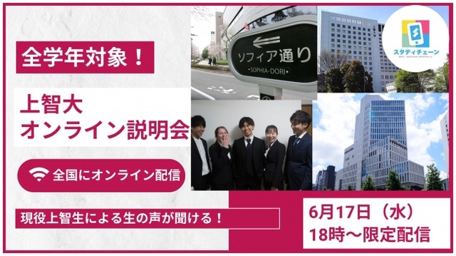 オンライン学習コーチングサービス「スタディチェーン」では、新型コロナによる春の説明会中止の影響を低減し、首都圏以外の受験生の情報格差を解消するために「上智大学オンライン説明会」を2020年6月17日(水)20時より配信します。