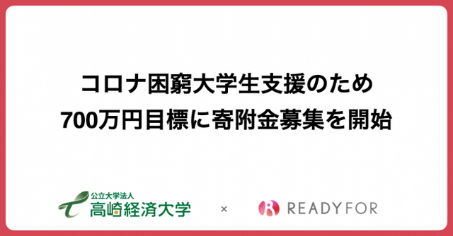 日本初・国内最大級のクラウドファンディングサービス「READYFOR」を運営するREADYFOR株式会社(本社:東京都千代田区、代表:米良はるか)は、公立大学法人高崎経済大学(所在地:群馬県高崎市、学長:村山元展)と本日1件目のクラウドファンディングプロジェクト「学生の未来を守る。高崎経済大学コロナ禍学生緊急支援特別基金」を公開し寄附金募集を開始いたしました。
