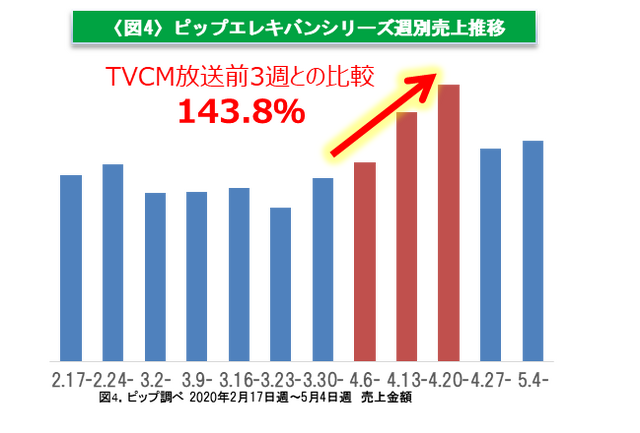 ピップエレキバンシリーズ全体の週別売上推移を見ると、4月上旬から下旬にかけて、その前3週間と比較して143.8%と大幅に伸長しています。(図4)