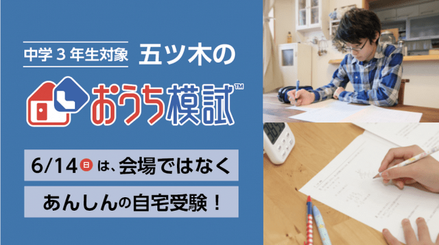 近畿圏で中学、高校受験の公開模擬テストの企画開発、運営を行う株式会社五ツ木書房(本社:大阪市、代表取締役社長:池上佳嗣、以下:五ツ木書房)は、新型コロナウィルスの影響により自宅学習を行う中学3年生を対象に、自宅で受けられる「おうち模試TM」を実施します。長年にわたり、受験生・保護者・塾・中学校・高校から信頼をお寄せいただいている五ツ木模試の新作問題にチャレンジ、その成績から暫定偏差値を算出し、五ツ木独自の志望校判定を行います。現在の学力と弱点を把握し、志望校との距離を計ることは、受験に向かう意欲を育みます。申し込みは6月4日(木)から6月9日(火)まで、公式Webサイトなどで受け付けています。