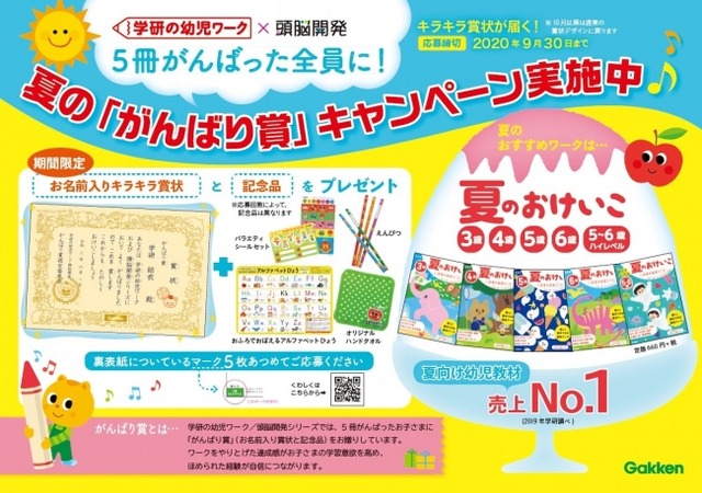 株式会社 学研ホールディングス(東京・品川/代表取締役社長:宮原博昭)のグループ会社、株式会社 学研プラス(東京・品川/代表取締役社長:碇 秀行)は、2020年6月1日~9月30日まで“夏のがんばり賞キャンペーン”を開催しています。5冊がんばった全員に「お名前入りキラキラ賞状」と「記念品」をお贈りします。