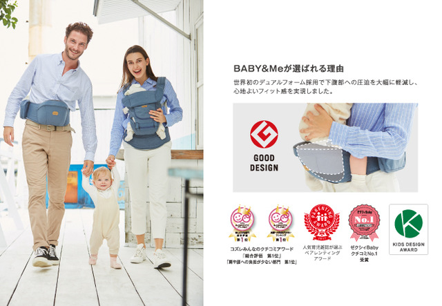 ※BABY&Meは、日本の安全基準(SG基準)認証や人間生活工学認証を取得し、キッズデザイン賞、グッドデザイン賞、ゼクシィBABYクチコミNo.1連続受賞など多くのアワードを受賞している日本のヒップシートキャリア(抱っこひも)メーカーです。人間工学に基づくデザインは、大阪市立大学との共同研究でも実証され、国際股関節異形成協会(IHDI)から公式認定されています。