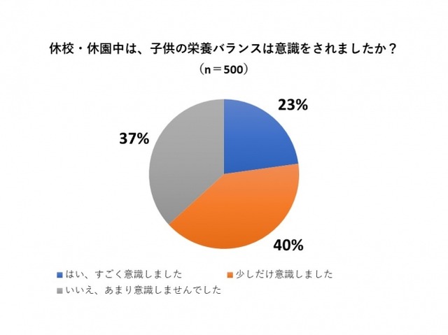 1都3県に住む、30代から40代の幼稚園から中学生までの子供がいると思われる女性に対して、新型コロナウイルスの影響による休校・休園中は、子供の栄養バランスは意識されましたか?という問いに対して「はい、すごく意識しました」と回答した割合が23%(114人)、「少しだけ意識しました」と回答した割合が40%(202人)、「いいえ、あまり意識しませんでした」と回答した割合が37%(184人)という結果になりました。休校・休園期間中は、朝昼晩3食を一緒にするご家庭が多いなかで、実に6割以上の女性が子供の栄養バランスに対して意識をしていたようです。「栄養バランスを意識した」という6割の女性(n=316)に対して続けて「具体的にどのようなことを意識、実施されましたか?」(複数選択可)という問いに対して、1位が「3食の食事を心掛けた」で69.9%(221人)、2位が「野菜を多く摂るように心がけた」で61.4%(194人)、3位が「朝食をしっかり食べた」で34.8%(110人)、4位が「蛋白質やカルシウムを多く摂るようにした」が33.2%(105人)という結果になりました。7割の方が3食をしっかり摂り、6割の方が野菜を多く摂るといった栄養バランスを意識的にされていたことが分かりました。